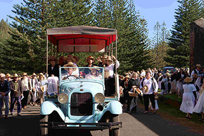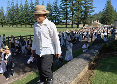 On Bounty Day, Pitcairn Island descendant families enjoy dressing in period costumes as they re-enact the arrival of their ancestors, as they landed at Kingston, Norfolk Island, all those years ago, and this year it was the 167-year anniversary. I love the plaited hats, and I wear my Norfolk hat with pride.