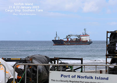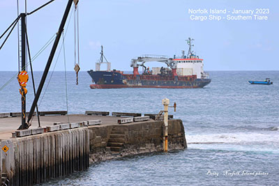 In January 2023 the Southern Tiare was aged 35 years old made the final cargo delivery to Norfolk Island. This Chatham Island vessel had been transporting supplies and cargo to Norfolk Island for many years. The Southern Tiare is a smaller ship and suitable for lighterage system used on Norfolk Island where nets are filled with cargo and then lowered in the nets to the awaiting lighter boats below. Modern freight ships are too large and too high to safely unload in this system. The traditional lighter boats are towed to the Cascade Pier or Kingston Pier where the nets are then lifted by crane to the awaiting shore crew who use forklifts to transfer the items onto awaiting trucks for delivery to Norfolk Island businesses. This system of unloading cargo ships on Norfolk Island is fantastic to watch and tourist enjoy viewing from the safety of the car parks and taking photos and videos.