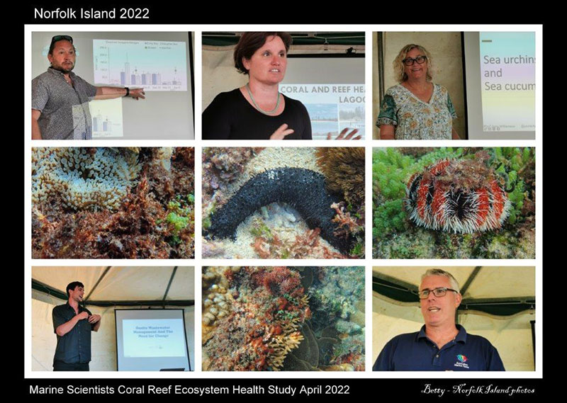 This research will provide an important record of the health of the unique coral reef ecosystem on Norfolk Island and the diversity of marine life in the Norfolk Marine Park. The research team shared some of the early result of this important project with the community at the public presentation on 21 April 2022. The public talk included information on reef health, coral disease, water quality and the importance of sea urchins and sea cucumbers on reef health.