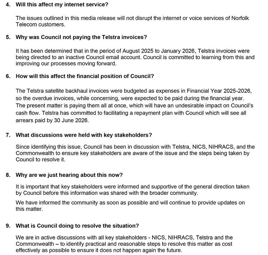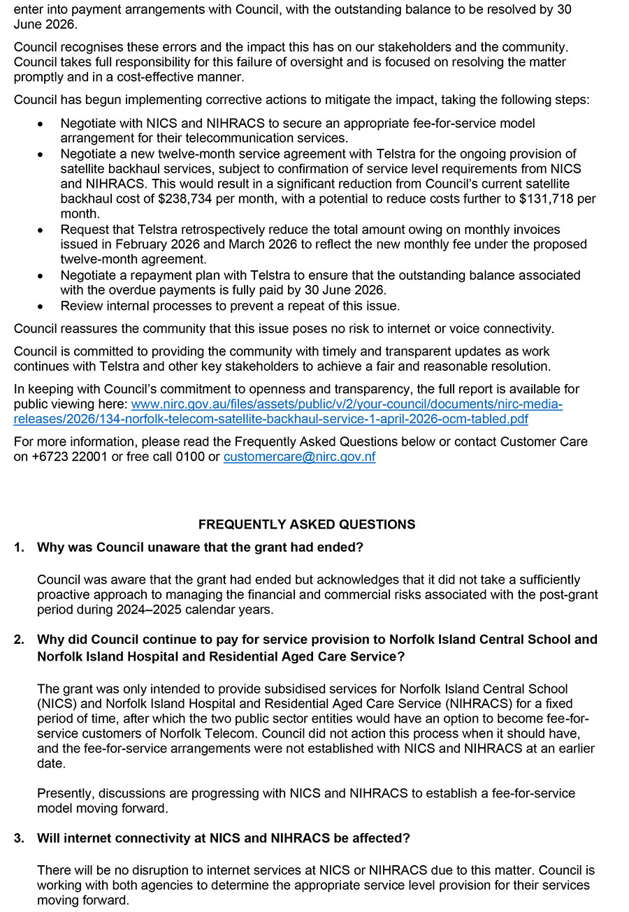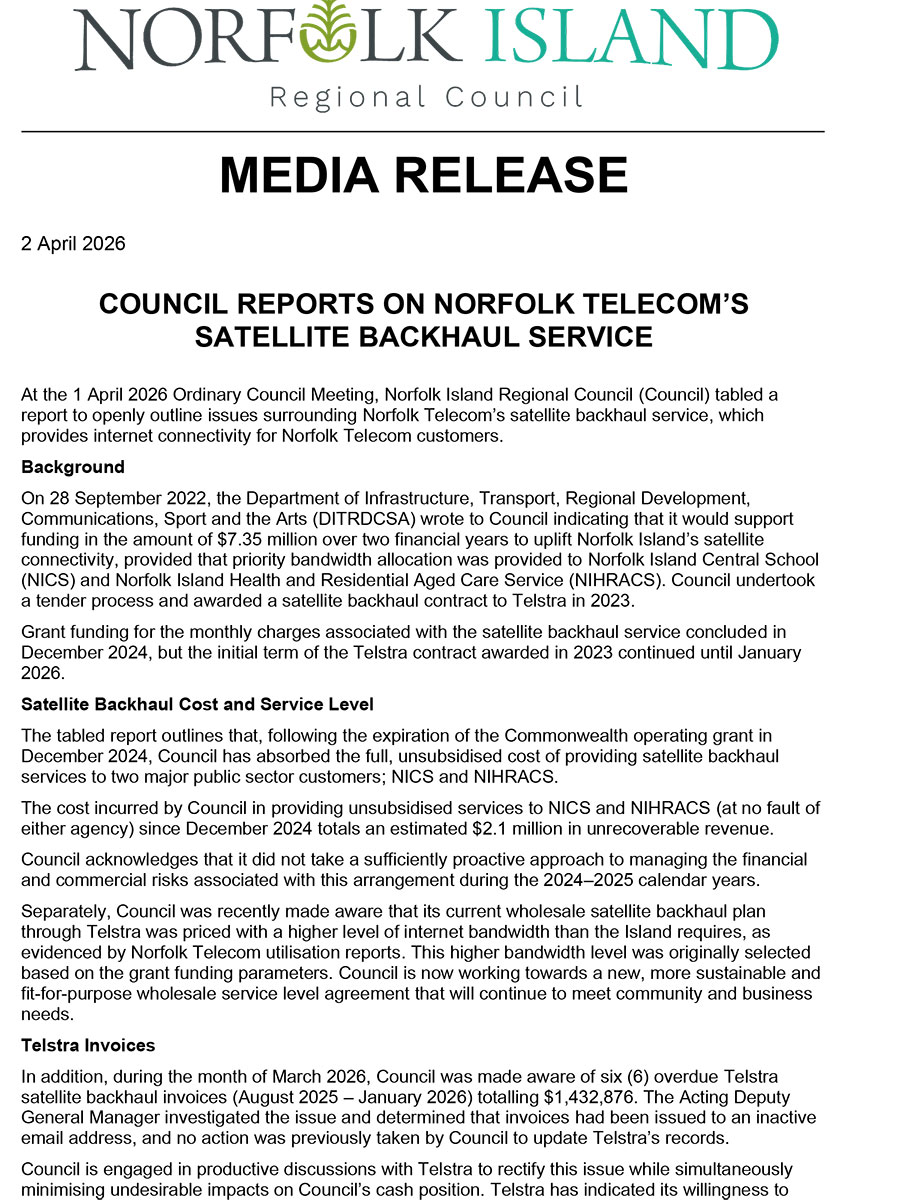 COUNCIL REPORTS ON NORFOLK TELECOM’S SATELLITE BACKHAUL SERVICE
