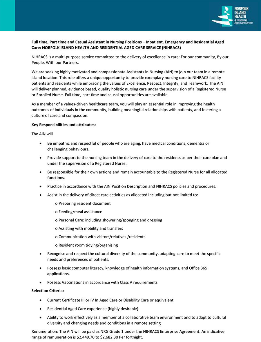 Full time, Part time and Casual Assistant in Nursing Positions – Inpatient, Emergency and Residential Aged
