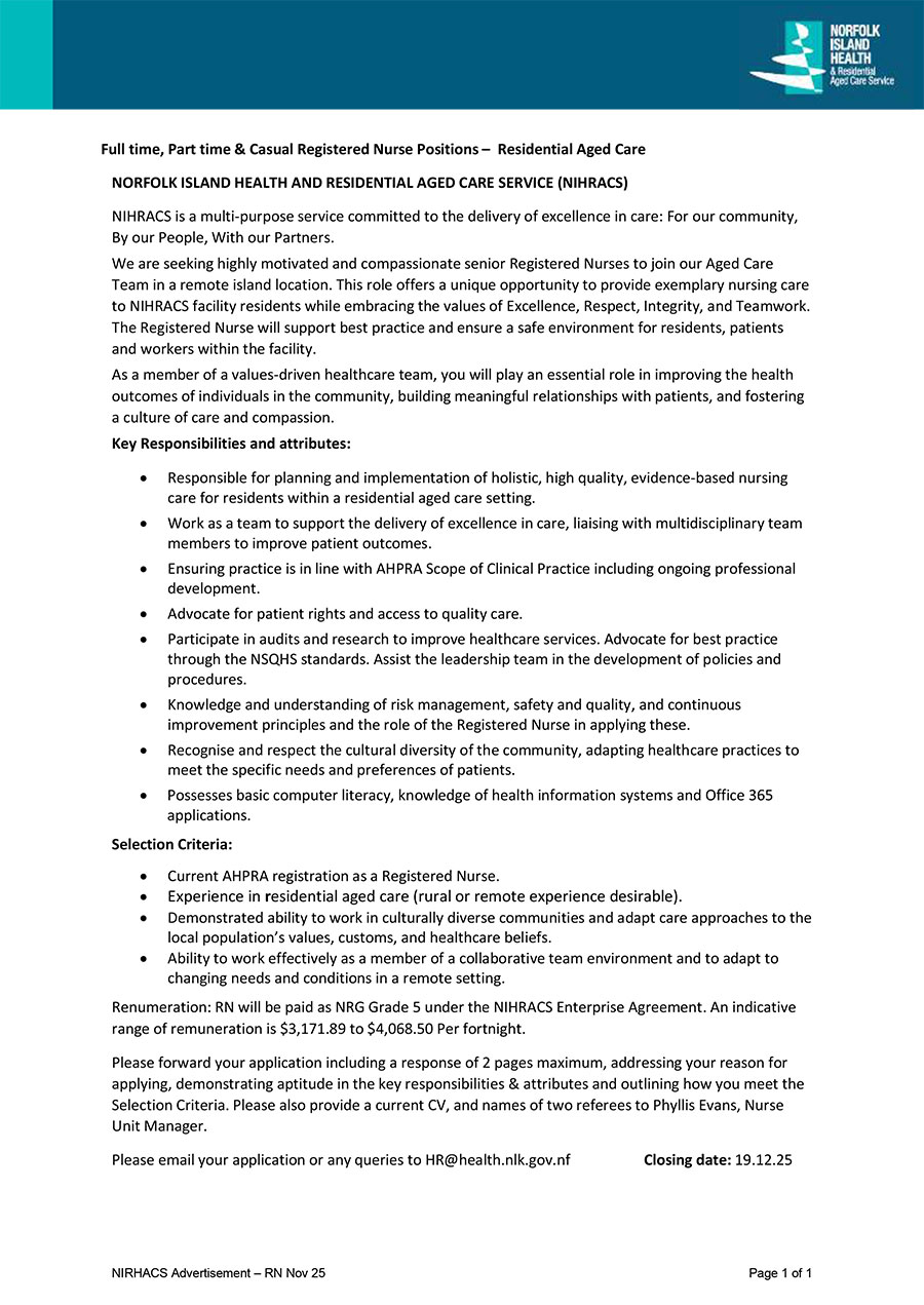 Full time, Part time & Casual Registered Nurse Positions – Residential Aged Care
