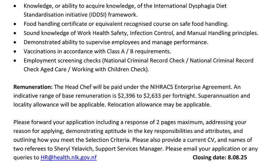 Head Chef – Norfolk Island Health and Residential Aged Care Service (NIHRACS)