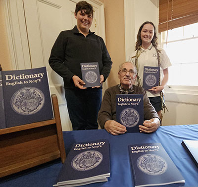 D' Norfolk Ilen Lairngwage Commission ess moes happy f’ present gen d’ Norfolk Island Council of Elders en yorlye d’ finished English to Norf’k Dictionary.