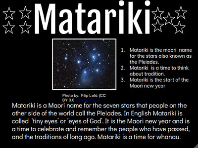 I have also found another excellent internet link, which has educational links, activities, and excellent explanations of Matariki and the stories of reading the stars, the Polynesian ocean navigation skills, and understanding the Māori stories of creation.
