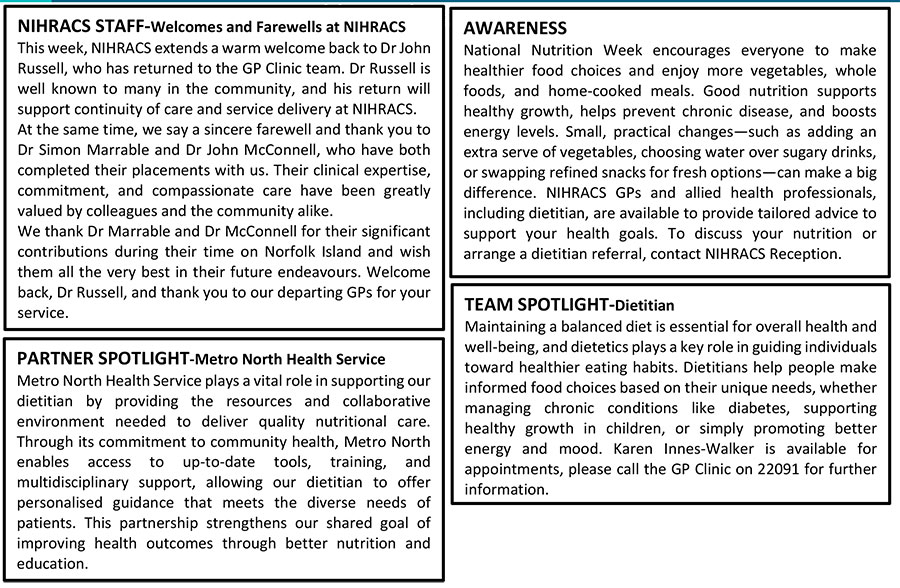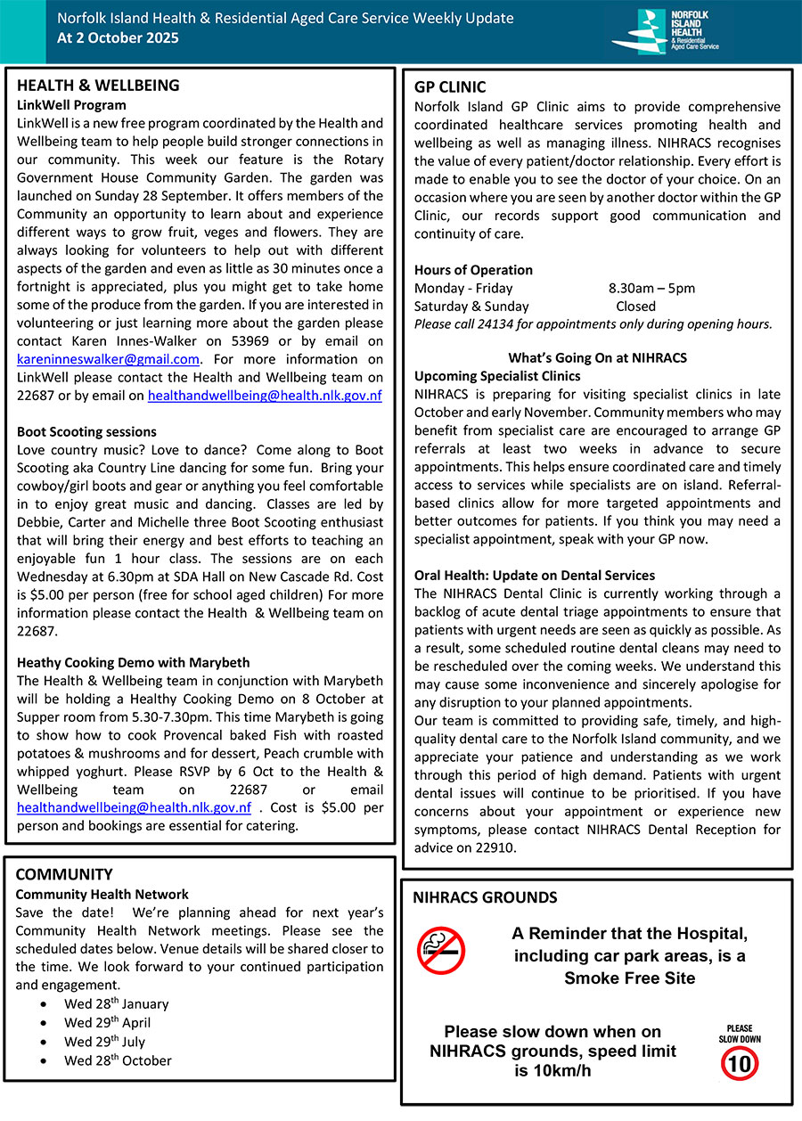 Norfolk Island Health & Residential Aged Care Service Weekly Update At 2 October 2025