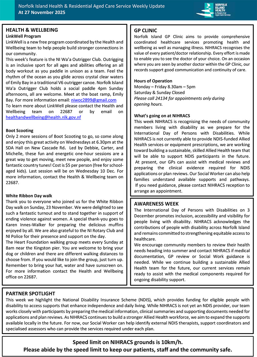 Norfolk Island Health & Residential Aged Care Service Weekly Update At 27 November 2025