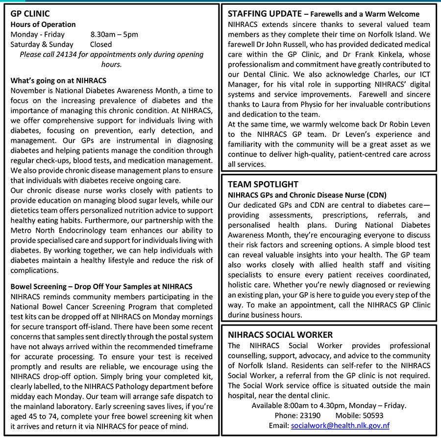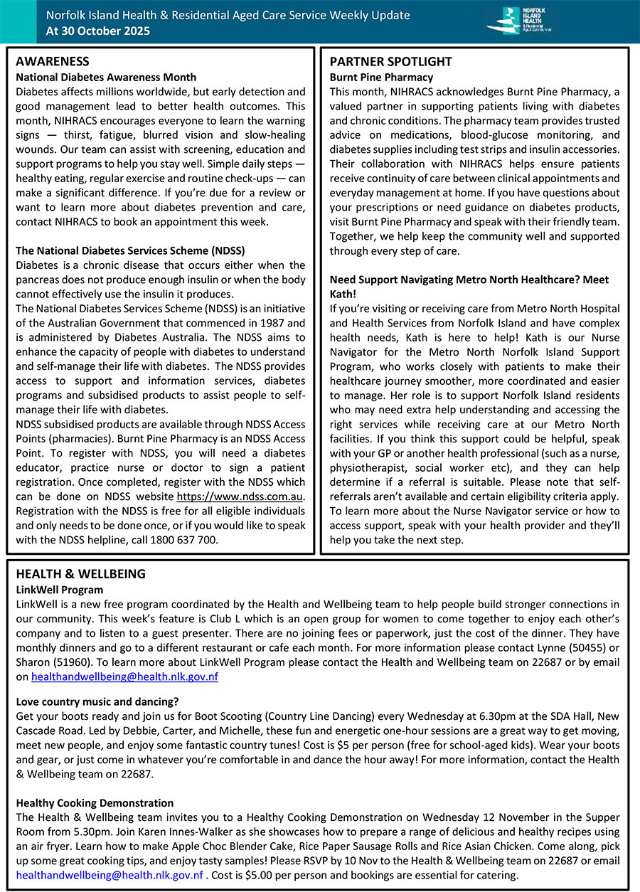 Norfolk Island Health & Residential Aged Care Service Weekly Update At 30 October 2025