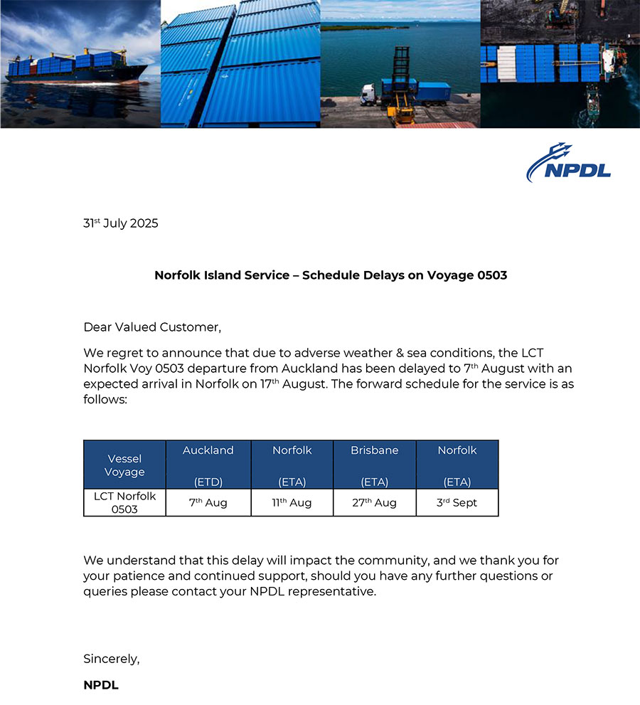 Norfolk Island Service – Schedule Delays on Voyage 0503