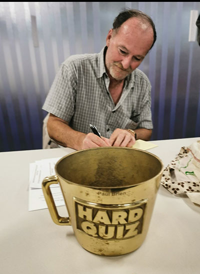 Here are a couple if images of Paul with the “Hard Quiz Mug” and of the Hard Quiz host, Tom Gleeson.