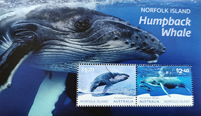 Last year, on 8 January 2024 Norfolk Island Humpback Whales postage stamps series was issued by Australia Post. The Norfolk Island Humpback Whales postage stamps series had two stamps in this set of postage stamps $1.20 Humpback Whale breaching and $2.40 Humpback Whale with calf.